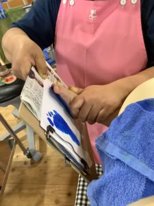 足に絵の具を塗ると冷たくて、くすぐったくて楽しそうです。
