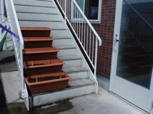 ご利用者が登園時に通られる、日当たりのいい玄関横の階段に置きました。