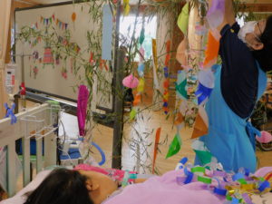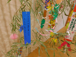 短冊はお家で書いてきてもらい、今年はご家族の願いもこもった七夕飾りになりました。