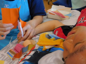はさみで切って・・・。のりで繋げて・・・。