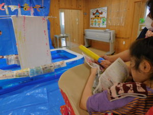 夏の強い日差しを避けて、夏らしい体験をしていただきたいと考える職員の気持ちが伝わる