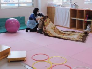 最後は毛布のトンネルです。出口がなかなか見つからず、最後には毛布の中で気持ち良く寝そべってしまいました。