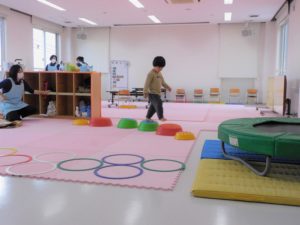 けんけんぱのコースもありました。リズムに合わせて両足を動かすことや,片足でバランスを取りながらのジャンプ、