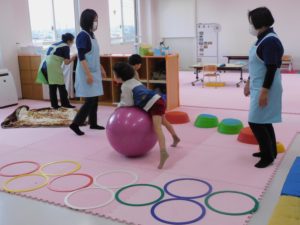 一通り身体を動かしたらバランスボールを転がして、追いかけっこ。のびのびと身体を動かせるサーキット運動で楽しい時間を過ごしました。