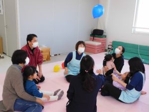 風船遊びの前にお集まりで、手遊びやプットインをしました。