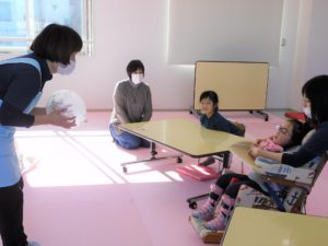 風船遊びの前にお集まりで、手遊びやプットインをしました。