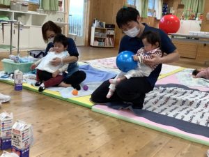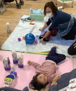 鬼の顔の牛乳パックを、ボールや体を使って退治しました。