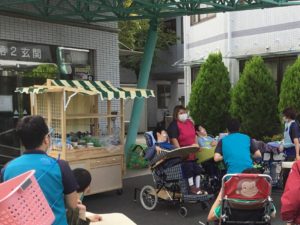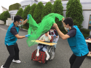 水風船を使った競技では、傘を使って割ったり、職員にぶつけたりと盛り上がりました。ワゴンにおやつも用意して、ご利用者に喜んでいただきました。