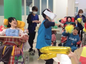 【1病棟】ホールでボウリングを行いました。まずは準備運動です。音楽に合わせて職員が盛り上げると、ご利用者もポンポンを振ったり、
