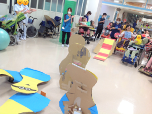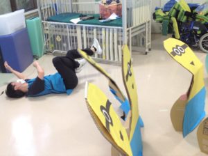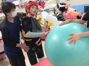 ボウリングのピンは大きく、ミニオンの形で可愛いですね。あれ、ミニオンに混じって職員が・・・。見事大当たりで大爆笑!始終笑いの絶えない活動となりました。