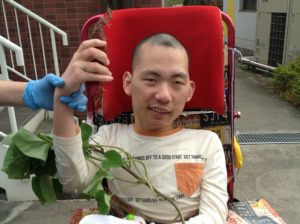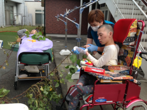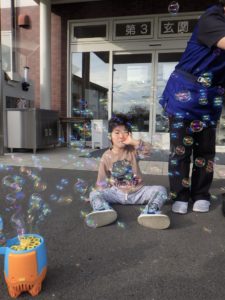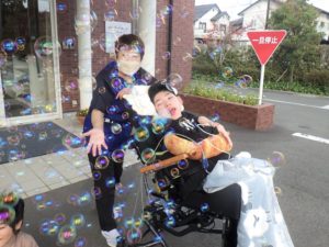 ご利用者は体に触れるとパチンと割れたり、空高く上がっていくのを見つめたり、シャボン玉が変化していく様子をみて大喜びでした。