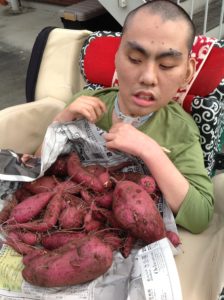堀ったばかりのお芋はひんやり冷たく土の匂いもして、手に持つとごつごつざらざらしています。お芋はご利用者の五感を刺激し、表情を豊かにしてくれました。