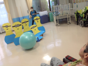 ボウリングのピンは大きく、ミニオンの形で可愛いですね。あれ、ミニオンに混じって職員が・・・。見事大当たりで大爆笑!始終笑いの絶えない活動となりました。