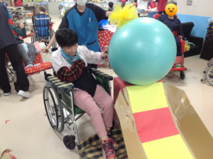 【1病棟】ホールでボウリングを行いました。まずは準備運動です。音楽に合わせて職員が盛り上げると、ご利用者もポンポンを振ったり、