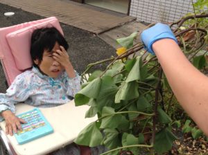 堀ったばかりのお芋はひんやり冷たく土の匂いもして、手に持つとごつごつざらざらしています。お芋はご利用者の五感を刺激し、表情を豊かにしてくれました。