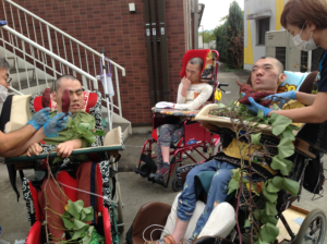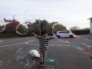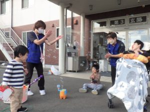 ご利用者は体に触れるとパチンと割れたり、空高く上がっていくのを見つめたり、シャボン玉が変化していく様子をみて大喜びでした。