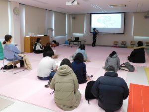 今回は、当センターの作業療法士が講師となり、「体と感覚の発達をうながす遊びと生活の工夫」についてのお話でした。