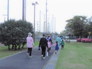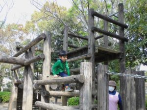 遊具のある場所まで頑張って歩きました。途中、ウォーキングをしている方とすれ違うと「こんにちは」とご挨拶もできましたよ。