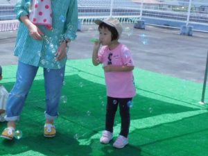 この日は晴天でしたが、暑さを緩和させてくれる風も吹いていて、シャボン玉が流れるように飛んでいきます。