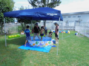 この日、外遊びはセンター内の職員駐車場脇にある広場でプール遊びです。先生に水を掛けていたずらしたり、水鉄砲で遊んだり楽しく過ごしました。