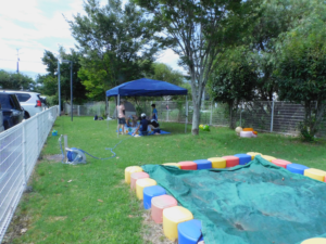 この日、外遊びはセンター内の職員駐車場脇にある広場でプール遊びです。先生に水を掛けていたずらしたり、水鉄砲で遊んだり楽しく過ごしました。
