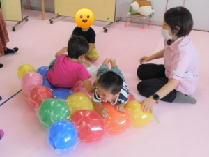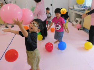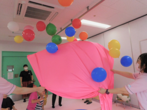 今度は、先生の「風船をこの中に入れてね♪」の言葉でピンクの布の中に風船を集めました。