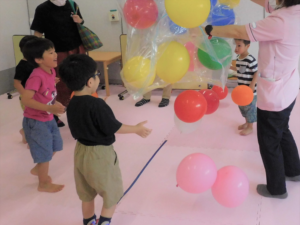 次は圧縮袋から風船を取り出すと、子どもたちは「わぁ!」「きゃぁ~!」と歓声をあげて風船を追いかけていました。