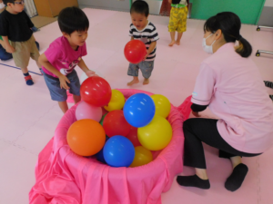 今度は、先生の「風船をこの中に入れてね♪」の言葉でピンクの布の中に風船を集めました。