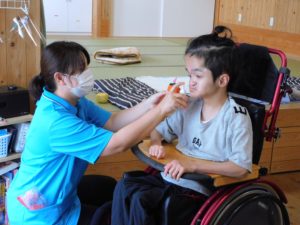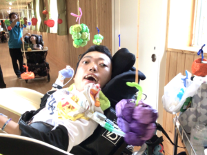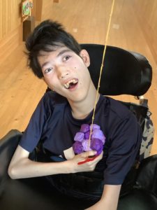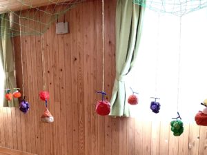 色紙の果物は、ご利用者の手に届くようゴムでぶら下げてあります。しっかり持って引っ張るとプチっと離れ、お目当ての果物をゲットしました。