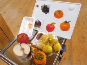 廊下で色紙の果物をもぎ取って、同じ果物のジュースやペーストなどと交換したら味覚体験を行います。