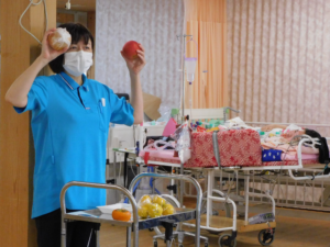 色紙の果物は、ご利用者の手に届くようゴムでぶら下げてあります。しっかり持って引っ張るとプチっと離れ、お目当ての果物をゲットしました。