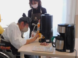 ご利用者がカフェスタッフとして笑顔で挨拶をしたり、オーダーをとったり、コップに飲み物を注いだりなどのサービスを提供されました。
