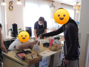 ご利用者がカフェスタッフとして笑顔で挨拶をしたり、オーダーをとったり、コップに飲み物を注いだりなどのサービスを提供されました。