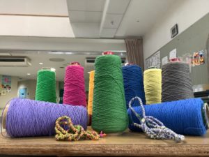 つむぎ糸製品の活動は、さをりの糸を紬いだ紐でアクセサリーや小物の製品を作っています。