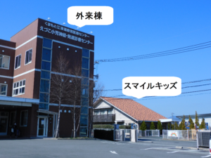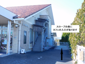 場所は★スマイルキッズ・事業所内保育(オレンジの屋根)敷地内のスロープ奥がカフェの入口になっています。