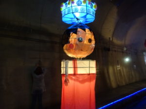 一般開放されている約550mのトンネル内に、高さ5mほどの七夕飾りがずらりと並べられました。