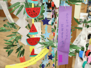 願い事の短冊は、お家で書いてきてもらい皆さんの思いのこもった七夕飾りが完成しました。