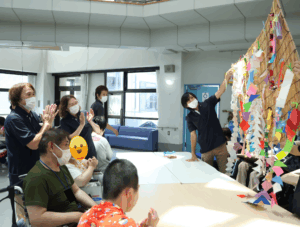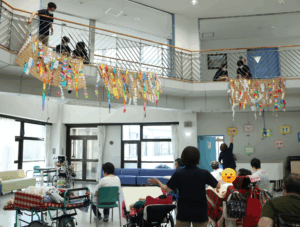 織姫と彦星が天の川の両岸に引き裂かれてしまい、ご利用者全員で天の川に星を並べて2人を応援しました。