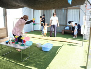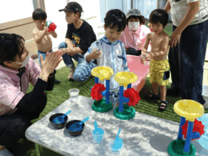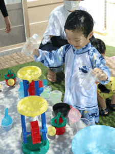 何度もコップで水を汲み水車を回したり、水風船をコップにいれておままごとをしたり、想像を膨らませながら遊んでいました。