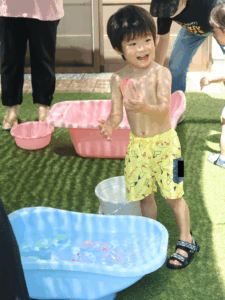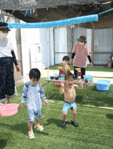 毎日暑い日が続きますね。そんな暑さを吹き飛ばすように、元気に水遊びを行いました。