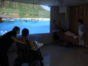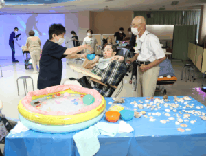 2病棟2階の地域交流スペースは、水族館に大変身!大きなスクリーンで海遊館の映像を流したり、タッチプールでクラゲに見立てたスライムや本物の貝殻に触るなど