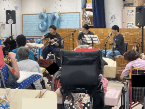 アコースティックギターやウクレレの音色と素敵な歌声にみんなうっとり♪ご利用者のリクエスト曲を一緒に歌ったり、楽しいひと時になりました。