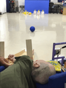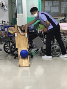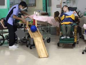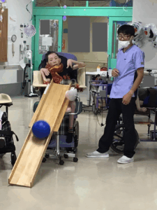 【2病棟】ボウリンググループがホールで活動されました。スロープを使って、遠くのピンを狙います。