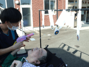 【3病棟】感覚グループが水鉄砲を楽しまれました。好みの水鉄砲を選んで、紙の的をめがけて狙いを定め、的が落ちると歓声があがりました。