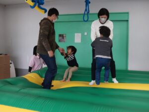 ふわふわと弾力性の高い、エアートランポリンの上を少し歩いてみたり、飛び跳ねたりして感触を楽しみました。