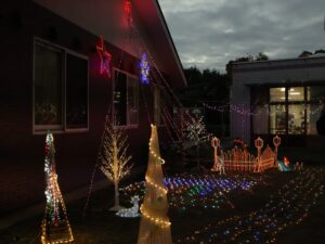 華やかな光に包まれた中庭は、クリスマス会への楽しみをさらに盛り上げています。